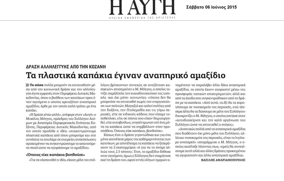 Συνέντευξη που έδωσε ο Πρόεδρος του Συλλόγου Ατόμων με Αναπηρία Π.Ε. Κοζάνης Περιφέρειας Δυτικής Μακεδονίας στην εφημερίδα "ΑΥΓΗ" αναφερόμενος στην διαδικασία συλλογής καπακιών και προμήθειας αμαξιδίων για την εξυπηρέτηση των μελών και πολιτών που χρήζουν στήριξη!